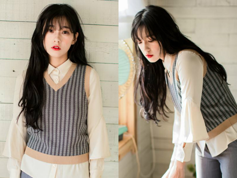 此款长发的发尾卷发效果不是很重,发尾上隐约可见几缕卷曲的发丝线条,把一侧长发披在肩前,不经意间衬托出女生温婉的一面,超薄的一层刘海透气感十足,使额头若隐若现更加突出了女生精致的五官,搭配背心衬衫又散发出满满的学院气息,想必这样的妹子在学校里是女神级别的的。