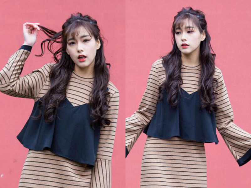 把披肩的长发加入卷烫处理,使头发变得卷曲有弧度,再选取一部分头发扎成半扎发,看起来清爽减龄,留出一层薄刘海垂在额头修饰脸型,黑茶色的染发低调自然,肤色也衬托得特别白皙。
