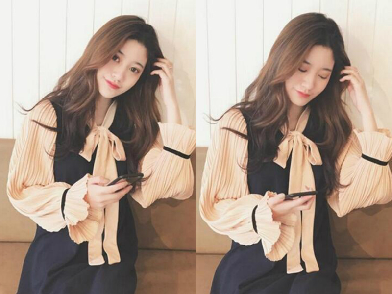 中分的刘海修剪露出女生一张好看的瓜子脸,光洁的额头更突出女生精致的五官,烫卷后的头发蓬松自然,垂坠在脸颊两侧又遮住两腮,衬得脸蛋愈发楚楚动人,搭配一条蝴蝶结连衣裙,更突出学生妹子的甜美气质。