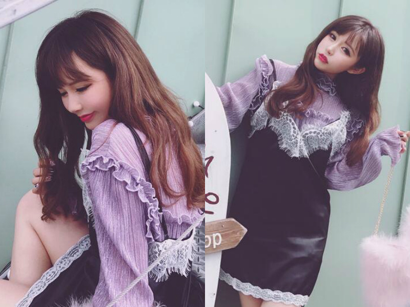 妹子一头长发披肩而落,额头无刘海遮挡使一张脸蛋展露,看起来柔美动人,长刘海在脸颊两侧的位置带着一丝轻轻的弧度,更修饰得脸型小巧,柔顺的发丝在发尾出加入卷烫设计,使发尾卷曲而充满弧度感,搭配蕾丝上衣,加上妹子低头的表情动作,倍显小女人的娇羞感。