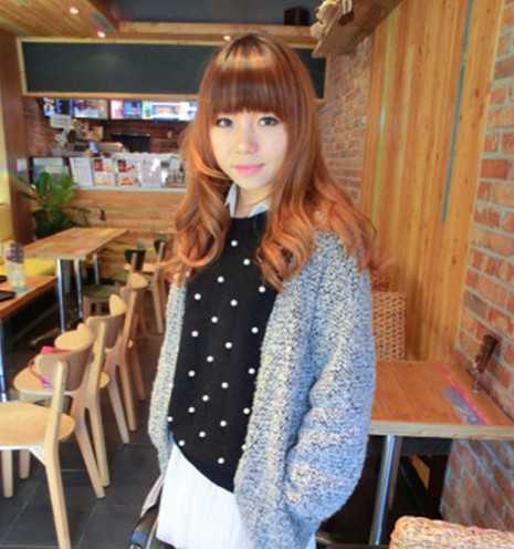 齐刘海再加上卷发一看就知道是可爱型的了,可以很好的体现女性可爱甜美的一面哦。
