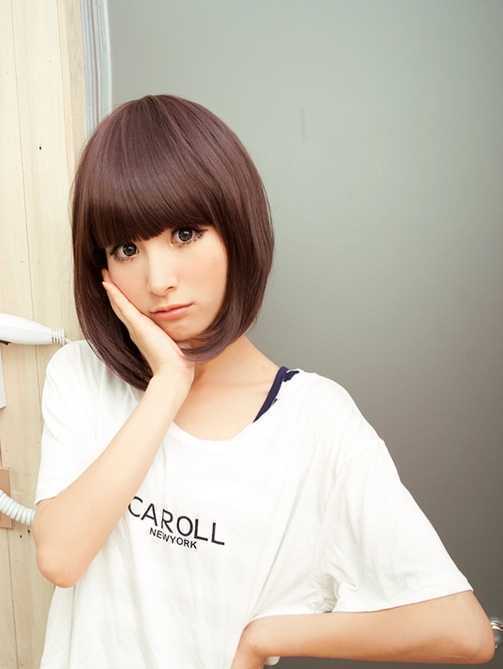 齐齐的刘海,眼睛变大咯,两颊顺着脸庞向里弯曲的头发,修饰脸型的效果超捧的,略带棕色的头发增添了几分时尚感,很清纯可爱哦。