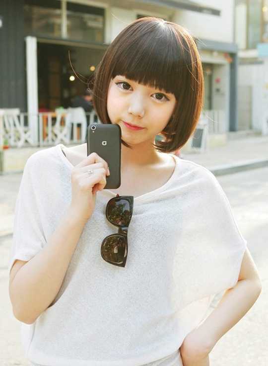 顺直的头发,齐齐的刘海,闪亮的眼睛,给人清纯动人的感觉哦,瞬间减龄,如果再卖卖萌更加可爱哦,很纯洁的感觉,有点小清新。
