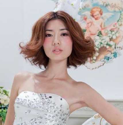 中分修饰脸蛋的效果捧哦,向外卷翘的发梢,高飞的感觉,非常显气质,微张的嘴唇,性感迷人,性感迷人又有气质的一款韩式中分短发新娘造型。
