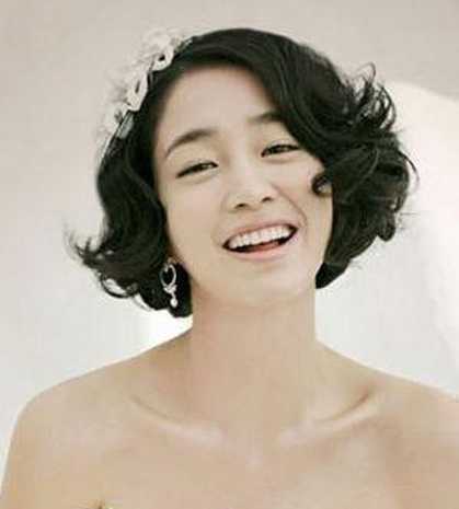 韩式俏皮短发新娘造型,两颊翻滚内翘的发丝,俏皮又可爱,斜刘海添了几分甜美,头上的发饰显得更甜美,一个笑容,阳光又有活气,赞哦。