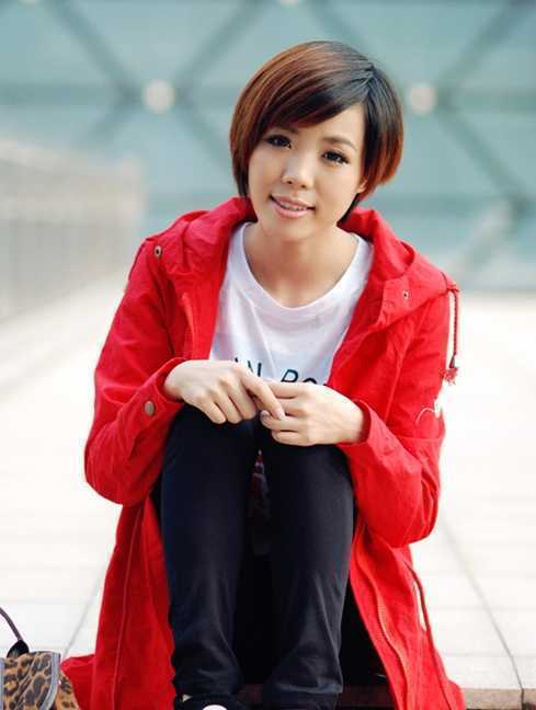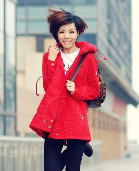 非常清爽的短发,搭上休闲舒服的大红外套,看上去有木有阳光灿烂,