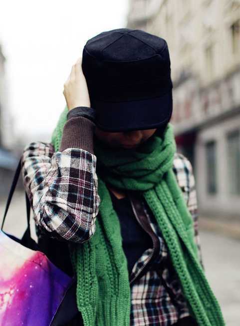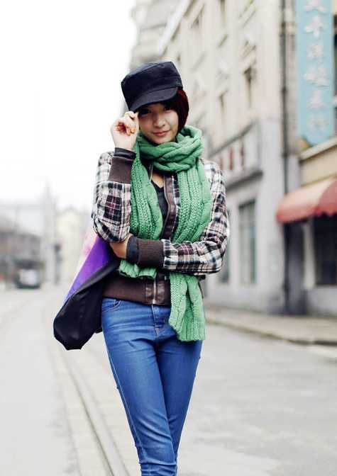 斜刘海的不对称短发,个性时尚凸显青春气息,搭上冬天必备的墨绿色围巾和帽子,