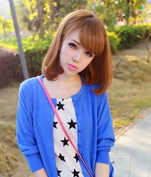 稍斜刘海,两颊内弧感的发梢,透着蓬松感,呈现出来的效果很甜美,清纯甜美MM大爱的一款减龄短发,染上亚麻黄色发色,肤色显得更白了,整个人也显得更漂亮了。