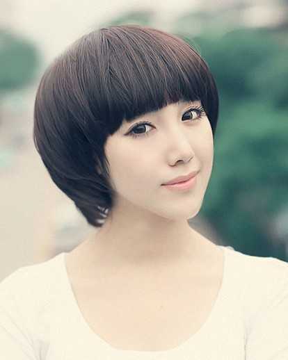 淡淡的栗色,整齐的刘海修剪,细碎的发梢,这样简单的一款锅盖头发型,给人感觉很文静很有淑女气质哦!