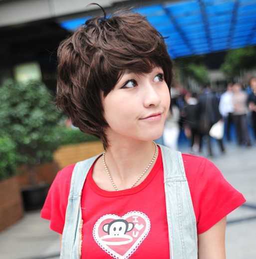波波头的卷发发型设计,带着凌乱卷翘的发梢设计,深栗色的发色,这样的一款短发发型,给人感觉十分的俏皮可爱哦!