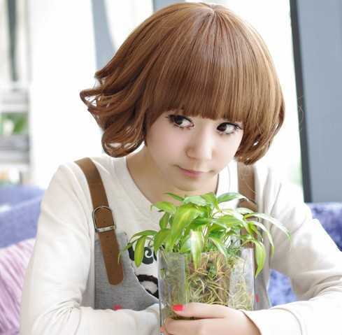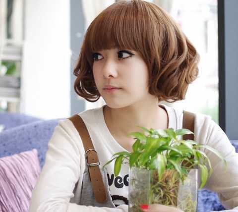 超可爱的蛋卷头发型,韩式风格,一头亚麻色发色,更是增添了时尚,还很好衬托出白色肌肤,卷卷的短发尾,紧扣着脸颊,很瘦脸。