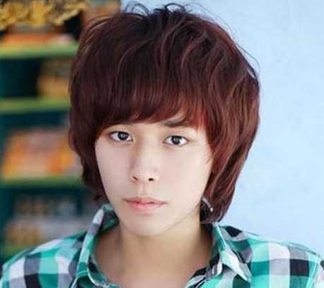 一头棕红发色,倍添时尚感,有点斜刘海,展现帅气,头顶经过处理的烫发丝,有点可爱感的男生蘑菇头发型,韩式风格,很流行。