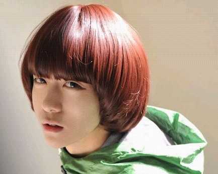 超显可爱风格的男生蘑菇头发型,前面是齐刘海设计,两颊内扣的短发尾,修饰脸型的同时,还增添可爱感,很赞的一款发型。