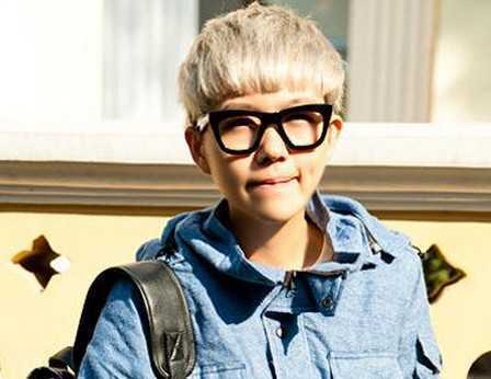出街抢眼的银色发色,很吸人,前面是剪齐的刘海,倍添可爱感,顶部是经过处理的烫发丝,增添潮流气息。戴上一副眼镜,超赞!