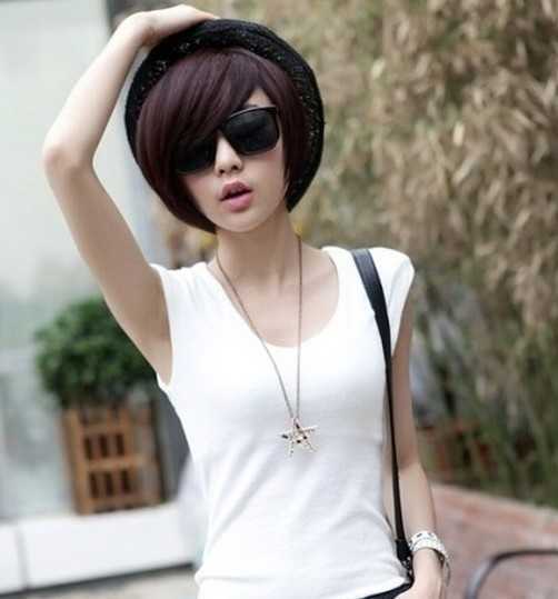 柔顺感的小清新栗子色十分韵味,两侧的短发紧贴在脸颊完美地修饰女生的脸部,斜分刘海搭配黑色小爵士帽显得更加有型,再加入一副帅气的墨镜,超有时尚街头达人范的一款女生短发。