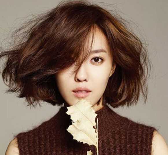 蓬松而极具飘逸的一款短发发型,把朴孝敏带出了少许的神秘色彩,大片侧分的刘海遮住了半个眼睛,又是迷人小性感气息,深棕色染发却是时尚的点缀力量。