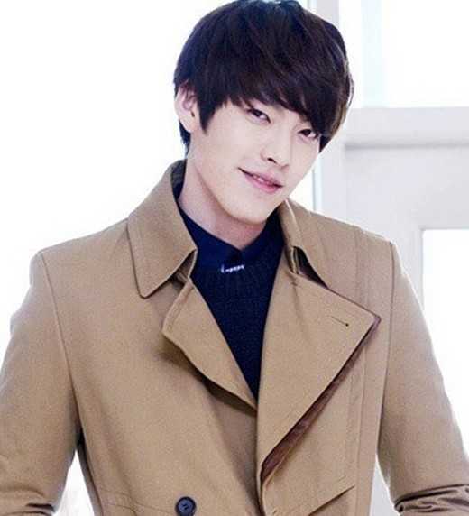 显得偏长脸型的金宇彬,剪上一个微斜的齐刘海发型,个性潇洒的他也能透出温柔清新起来了,一身浅棕色的大衣搭配毛衣打底,十足的气质优雅型男魅力。