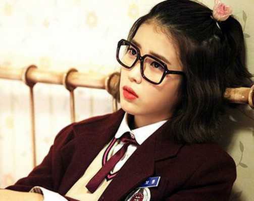 微微蛋卷的短发发型,刘海往后扎起个小马尾,佩戴个黑色眼镜框,将韩国女歌星IU尽显那清纯文艺女生感觉,无辜大眼也起到了可爱之处。