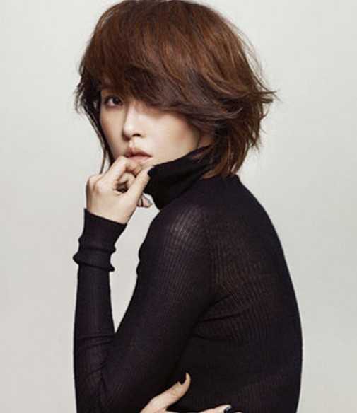 酷酷的一款蓬松女生短发,半遮眼的斜卷刘海,营造出几分帅气有型的感觉,搭配一件黑色毛衣,又是呈现知性范的女性魅力!