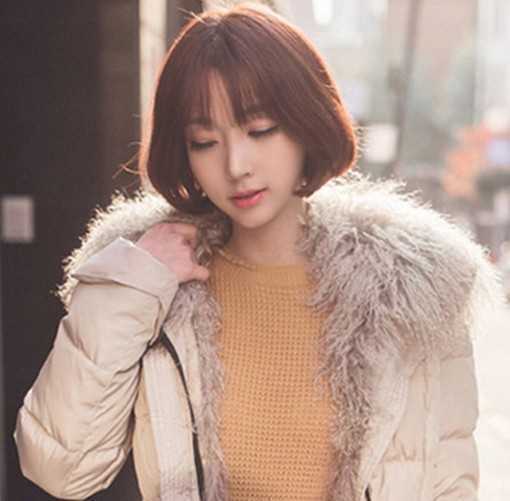 轻盈的齐刘海散发几分清纯甜美气息,深棕色的短发在阳光的衬托下,俏丽减龄百分百,发尾处完美的内扣,修颜极致,非常适合圆脸妹子哦!