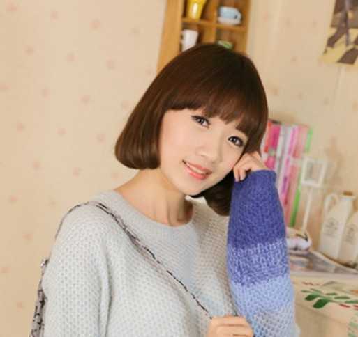同样是萝莉款式的短发发型,而柔顺的齐刘海修颜外还能是甜美的体现,发尾处采用内扣的设计,时尚而可爱可人呀!