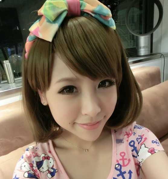 非常甜美萝莉范的女生韩式短发发型,微微内弯曲的发尾,特别显得活泼和年轻,斜分刘海搭配蝴蝶结发带,倍增淑女的恬静魅力感!