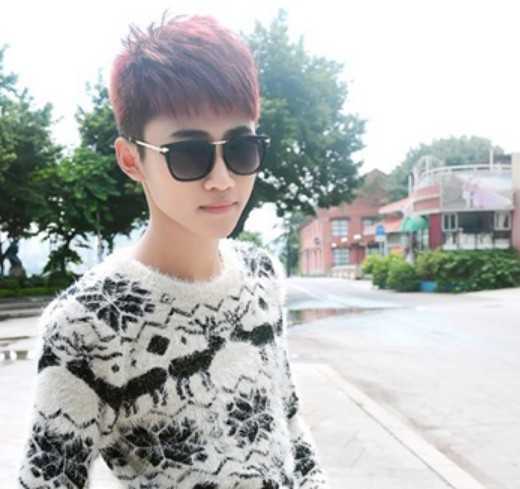 酒红色的挑染发十分靓丽,轻薄的齐刘海尽显那俊朗迷人脸孔,蓬松的短发造型搭配上炫酷墨镜,让男生瞬间变得酷酷帅气的。