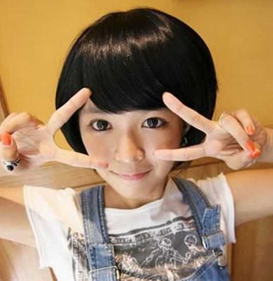 无比的纯真女学生,乌黑发色的短发蘑菇头就是最适合发型了,微微斜分的刘海凸显精灵大眼,可爱的V字手势,2014俏皮卖萌极了!