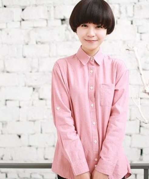 看起来比较呆萌的学生蘑菇头,圆润的短发造型,让整体发型弧度饱满感,齐刘海搭配简单衬衫,小清新可爱十足哦!