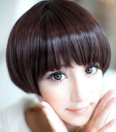 时尚柔顺短发发型,深棕色的染发让这款蘑菇头呈现出完美的光泽感,碎薄修剪的刘海下,又是修饰了圆脸作用,大眼的妹子也是瞬间变得精灵可爱起来。