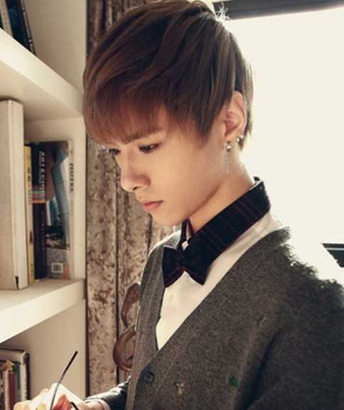 一款充满文艺范的男生短发,时尚的浅棕染发又显得暖男气息,毛衣领结的打扮后,轻松呈现出经典的文艺男生造型。