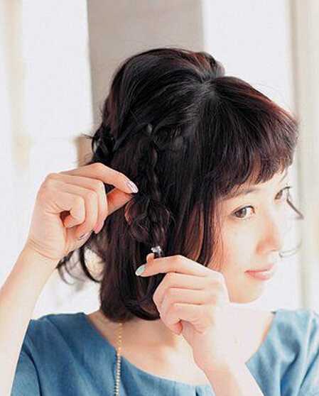 3、然后挑取小发束分别编织麻花发辫并扎好。