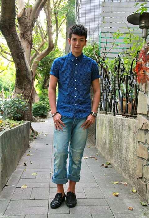 柯震东这款阳光短碎发造型非常清爽时尚的,有活力,黑色的短发,头顶用发胶打造蓬松的发丝,在搭蓝色立领衬衫和破洞宽松牛仔裤焕发出校草风范。