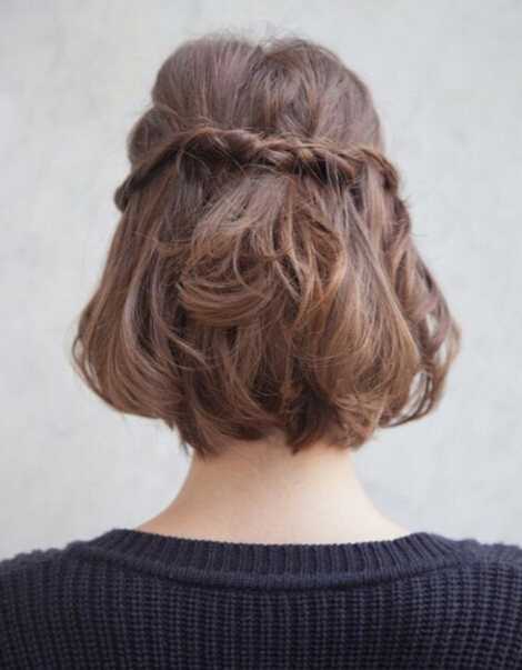 学生头短发发型图片5、平时觉得总留短发没意思,那可以尝试一下diy,如图中这款,刘海两边往后编一条麻花辫再绑在一起,一款清新可爱的短发编发就完成了,学生们可以尝试一下,很好看哦!