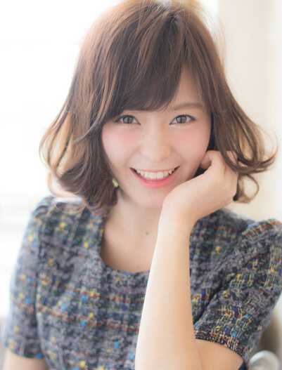 齐肩的短发烫出蓬松内扣的效果,搭配斜分的刘海,尽显时尚干练,一边的头发挂在耳后,不对称的设计完美修饰脸型,橙棕色染发提亮肤色,非常适合职业女性。