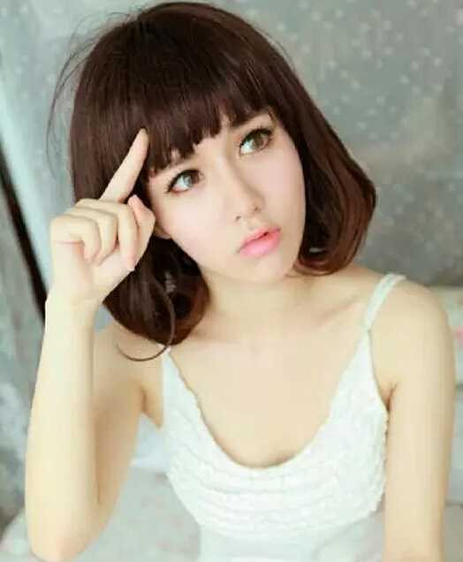 6、美妞自晒的短发发型,齐刘海,发尾内卷齐肩,整个给人小清新的感觉,美美哒,这个短发比较适合脸型小点的美眉。