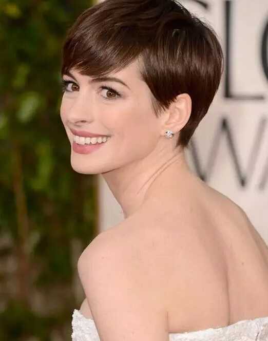 1、安妮凯瑟薇的短发,有一点点偏分的刘海,再加上精致的妆容,回眸一笑,那个感觉,说帅气也行,说女人味也行,特别的彰显气质。