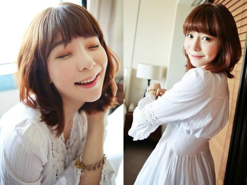 韩式齐刘海及肩烫发也是许多学生MM的至爱,再染上一个栗色发色,它是如此的可爱与时髦,微卷的发尾造型不会过于夸张,可给人一种单纯的感觉。