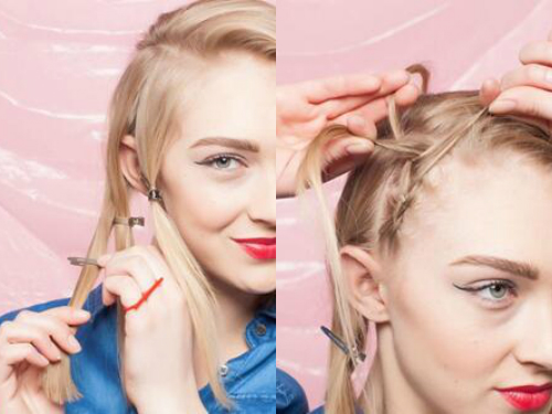在打理好头发之后,我们可按图示将头发分区,二八分或一九分皆可,然后将少的一侧头发分成三小束,使用发夹固定好,然后将第一束头发往上编成麻花辫。