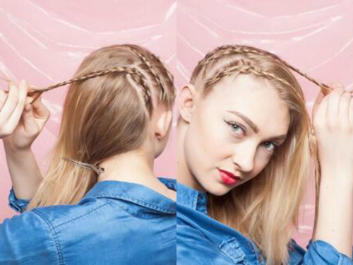 之后继续将剩下的两束头发往头顶方向编麻花辫,注意调整每条发辫之间的间距。