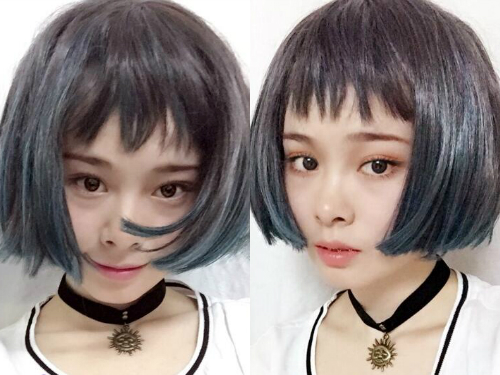 原宿风“狗啃式”的刘海+波波头齐耳短发设计很有层次感,渐变灰绿的发色更是罕见,可谓是相当有新意的一次色彩混搭,整款发型简直潮爆了。