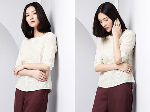 凌乱style的无刘海中分短发层次分明,空气感顺势而生,脸颊处较薄头发自然飘逸,发尾经过微烫而向里面扣起,瞬间修脸,尔后在深亚麻色发色的衬托下整款发型潮到极致,十分吸睛。