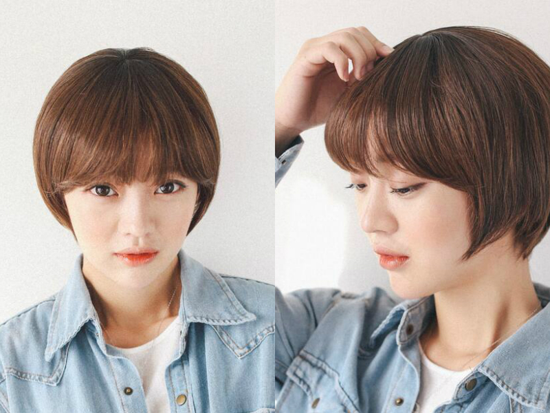 其实蘑菇头早在七八十年代就很流行了,那时多数女生都是齐耳蘑菇头发型,即便到了现在也依然是潮流。顺直的头发修剪到耳朵的位置,露出尖细的下巴,剪至眉毛上方的刘海有点小凌乱,但很好地修饰了妹子的长脸型,从头顶至耳旁都蓬起来的头发看着就像个可爱的小蘑菇,乌黑的发色更增添纯纯的学院小女生风采。
