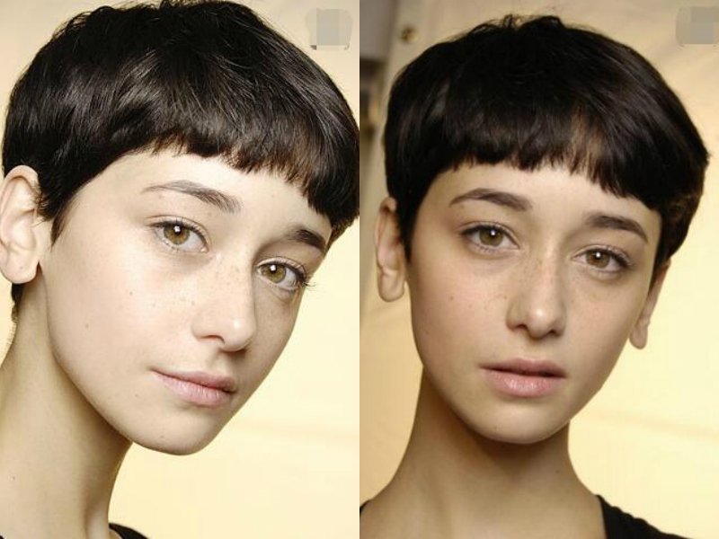 这是给人以奥黛丽·赫本式精灵感觉的一款短发发型,纯黑的发色清新自然,修剪得极短的发尾不但减去了出汗长发带来的粘腻感,更显出女生修长的脖子线条,二次元式的刘海萌萌的,半遮住额头清凉透气,显得本就瘦削的脸蛋越发细小了。