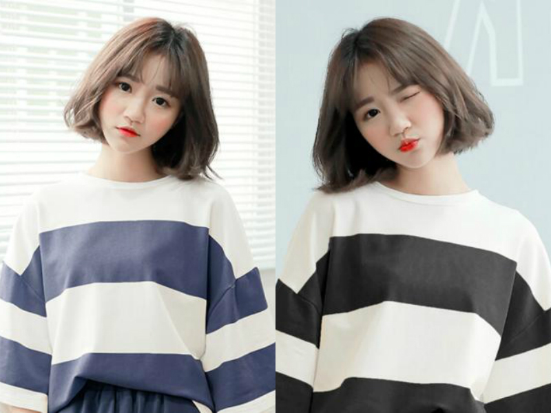 经典的黑色是最百搭的发色,搭配短发发尾烫发发型更是好看。妹子一头黑发自然的从头顶落下到脖子的位置,在发尾加入了烫发效果,使本来简约的发型变得新颖起来,几缕刘海随意拨弄,若隐若现的额头显得脸蛋很是精致,再在头上用彩色丝带扎几根小细辫,则更加个性十足了。