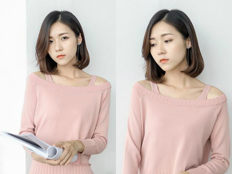 在齐下巴的短发发尾处进行内扣处理,轻轻松松就打造出了一张精致的小脸,发尾内扣收拢下巴,突出女生尖细的下巴,三七分的刘海设计使侧边脸被遮住,更突出女生立体的五官,搭配露肩吊带上衣,露出性感的锁骨,立刻增添女人味。