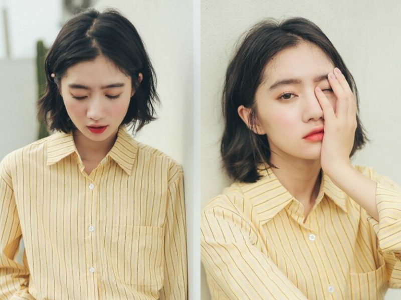 乌黑的发丝看起来自然纯净,头顶上的分界虽不是垂直的线条,却给人一种特别的感觉,额头无刘海遮挡,看起来清新舒适,发尾修剪到与下巴平行的位置,把两侧头发夹至耳后,刚好把一张干净的脸蛋呈现出来,发尾的发丝似乎经过卷烫,带着轻微的卷翘效果,不经意就带出了活泼感。
