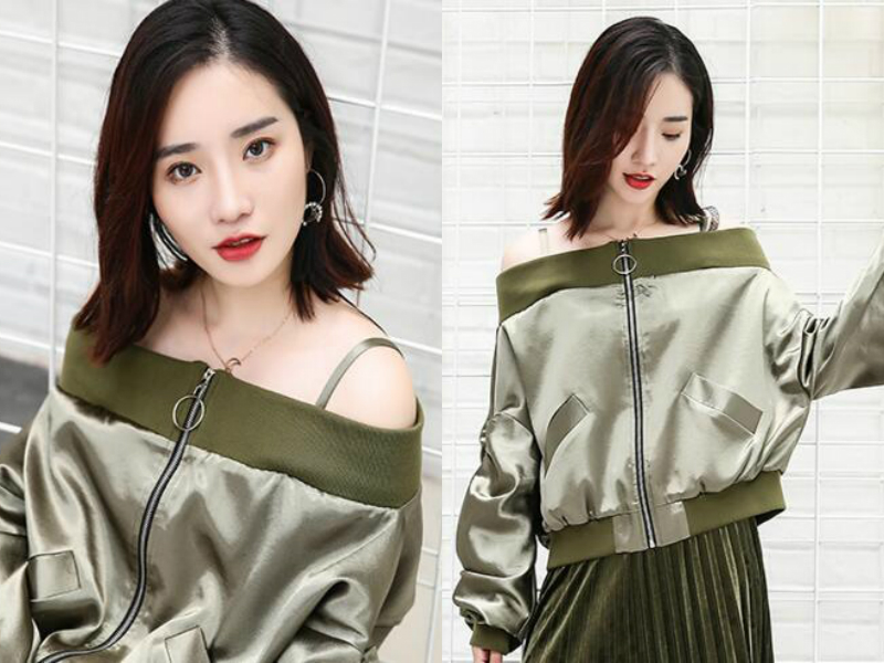 自然的直发长度刚好及肩,发尾打理出轻微外翘的效果,显得俏皮活泼,二八分的长刘海轻轻斜向一侧,修颜显瘦之余更使五官显得立体精致,纯净的黑发衬得肤色很白,在穿搭方面弄点小心机,露肩的外套独特又潮流,使整个朋克造型性感又酷帅。