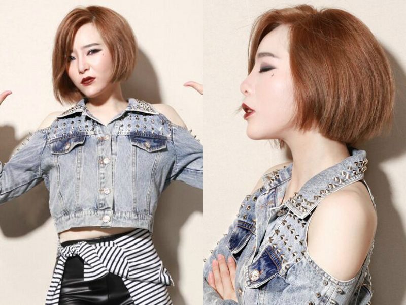 有没有觉得妹子的装扮特别酷炫?二八分的朋克发型利落有型,发尾紧贴下颌线,突出尖细的下巴,二八分的刘海侧遮住半边脸,起到很好的修饰脸型效果,玫瑰金的发色时尚绚丽,再加上夸张的烟熏妆,妥妥的朋克女郎形象立马诞生。