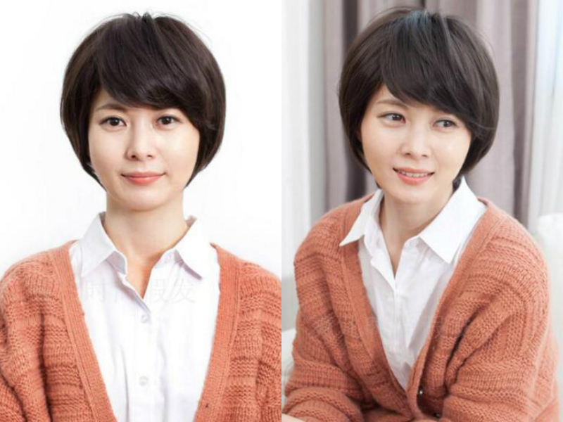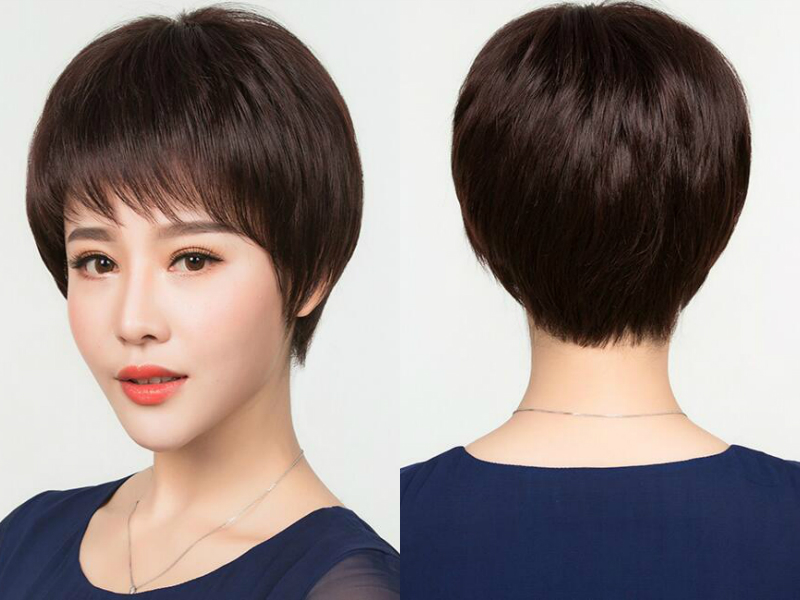 也许是越上年纪的人气质越优雅,所以即便是留干练的短发也会让人觉得端庄。这是一款有点类似于蘑菇头的短发假发发型,发丝蓬松丰盈,展现出女生饱满的头型,厚实的刘海打理得整齐有致,光亮的发丝使整个造型更显自然得体。